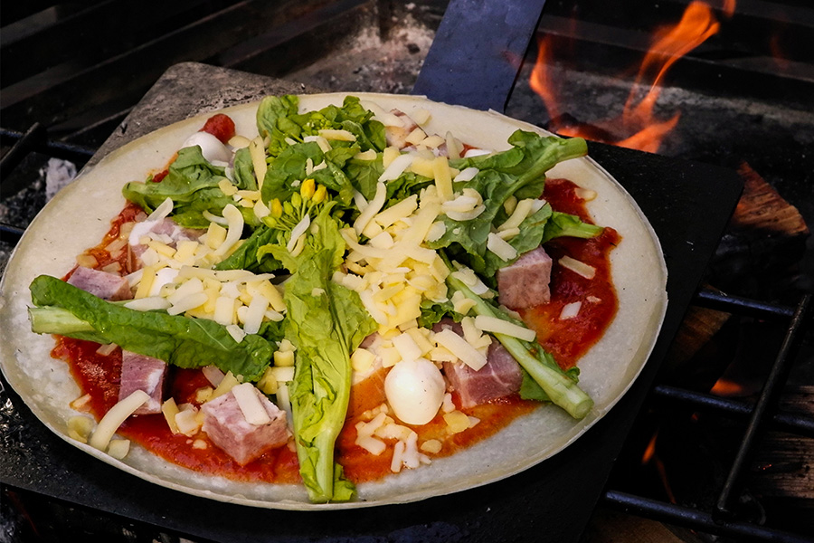 函南の燻製屋こだわりのベーコンを、熱海の河津桜チップで香ばしく燻製。ほんのり甘い香りとバジルの爽やかさが心地よく調和する一枚。